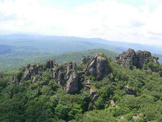 3、象牙山。为火山岩地质公园。金朝时称此山为松山,亦名“向阳山”,后因音转为象牙山。象牙山风景区面积为99平方公里,为长白山哈达岭余脉,主峰高615.2米。