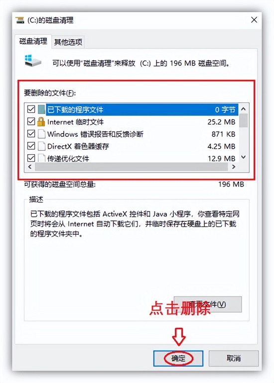 2.随后自动打开C盘的清理窗口,勾选要删除的文件,我一般都是全部勾选的,接着点击「确定」,等待清理完成。
