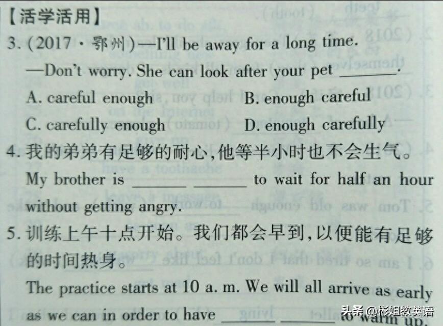 (2)enough 作副词,意为“足够”,修饰形容词或副词时,均放在所修饰词的后面。例如: