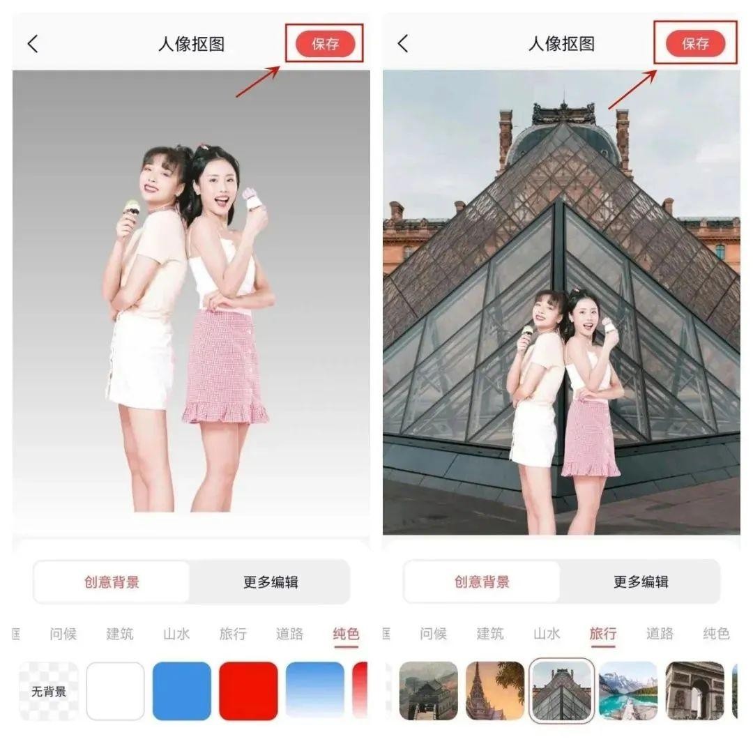 对于抠好的人像或物品,我们还可以在背景模版中添加其他纯色背景或创意背景图,满意后点击右上角的“保存”按钮即可。对于抠好的人像/物品,我们还可以自由添加纯色或其他创意背景,让图片效果更加丰富。