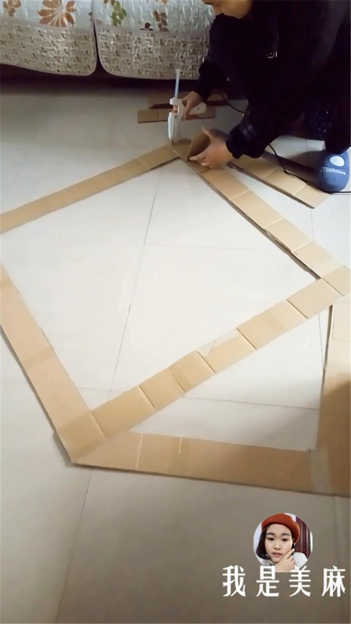 因为都是小纸箱,所以折痕比较多,这里采用砌墙的方式,用热熔胶替代水泥,一块块往上粘,每层纸板折痕的位置一定要错开,一共加厚五层。