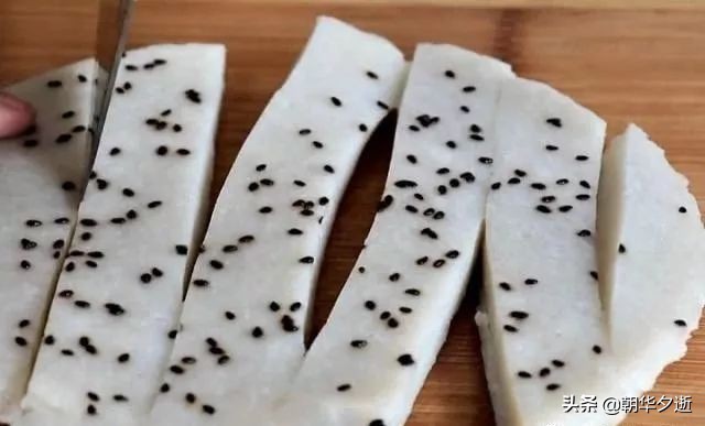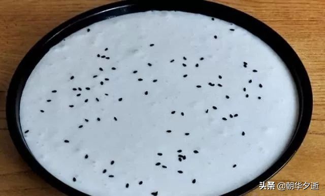第三步:准备一个模具,或者是一个深点的盘子,在盘子底部刷一层油,把山药糊倒进去,撒上一层黑芝麻,盖上一层耐高温保鲜膜,用牙签扎几个小孔,热水上锅蒸20分钟,时间到出锅晾凉,然后脱膜切成小块即可。