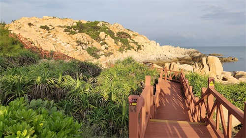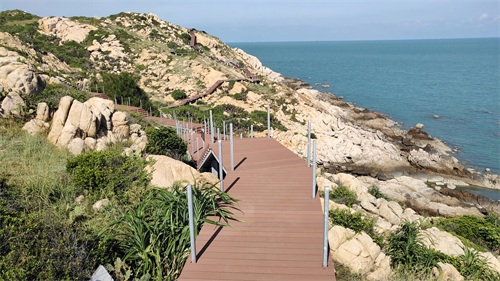 海边修建了很长的栈道,游客可以沿着海岸线登高游览。
