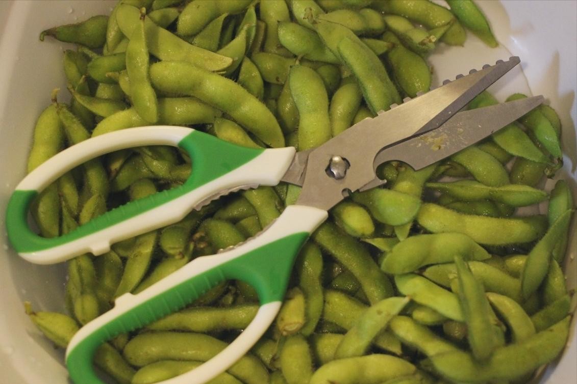 2、泡好后的毛豆,捞出来再用清水冲洗一下,随后用剪刀,把毛豆的两端,一个一个地剪掉。多做这一步之后,再来下锅煮的话,煮出来的毛豆肯定会更入味。接下来把干辣椒、八角、香叶等香料准备好。