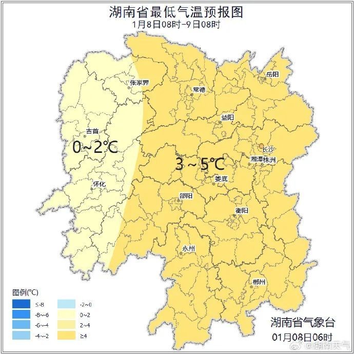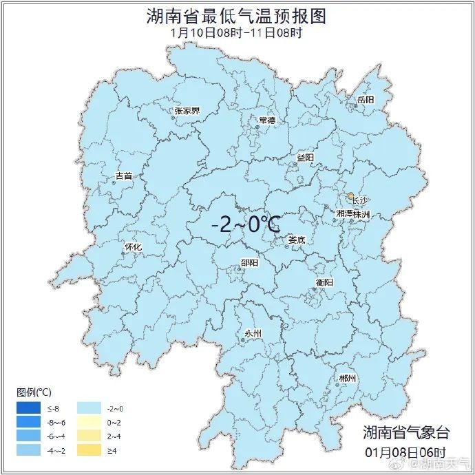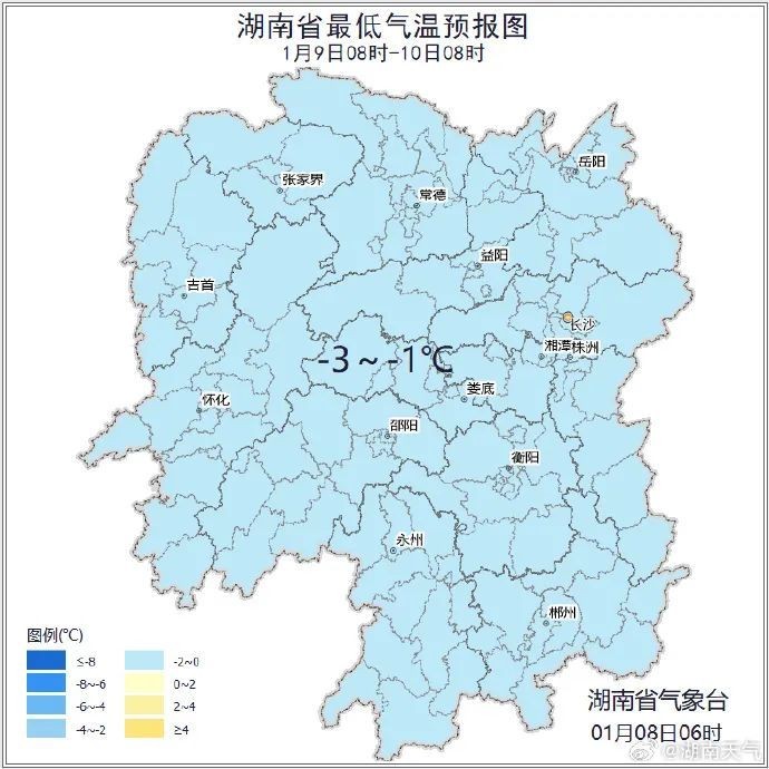 1月9日白天到晚上,湘中、湘北阴天有小雪,其中湘西南地区有中到大雪,郴州南部多云间阴天,其他地区阴天有小雨或雨夹雪,10日早晨湘西部分地区有雾;北风3~4级,局地阵风6~7级;最低气温-3~-1℃;最高气温湘西3~5℃,湘南10~12℃,其他地区7~9℃。