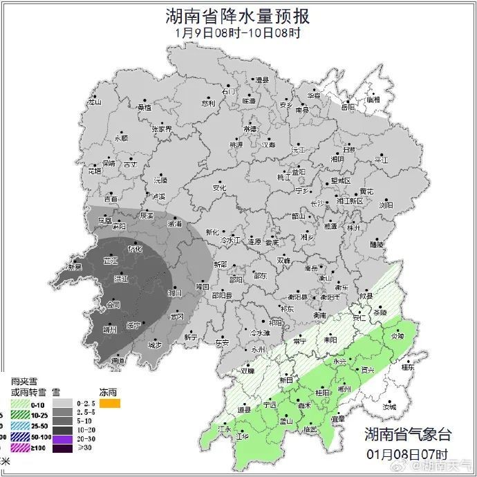 据省气象台预测,1月7日至9日,全省自北向南有一次降温降雨天气过程,湘西局地将迎来大到暴雪。