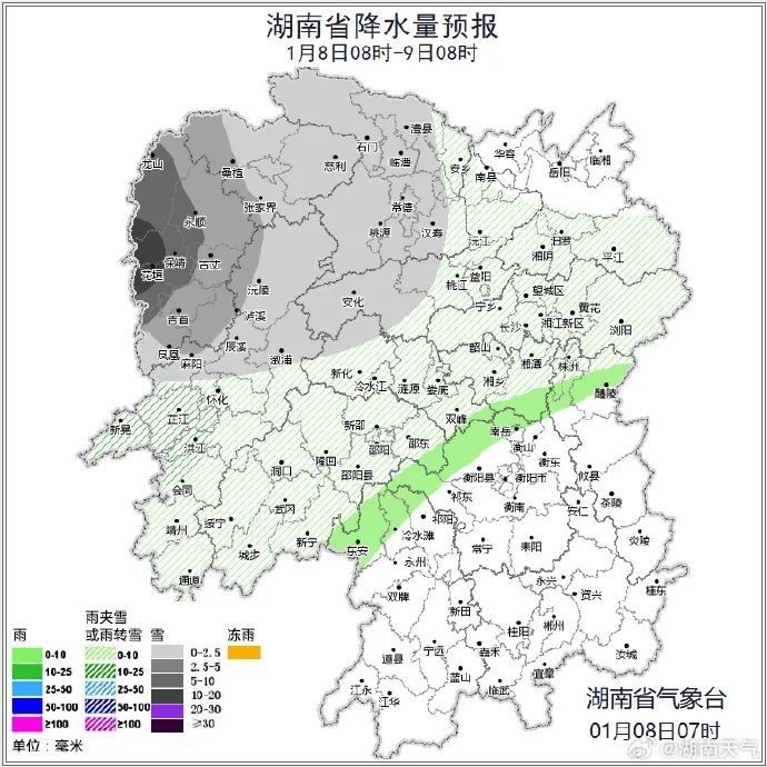 湖南天气实况:监测显示,昨天(7日)07时至今天07时,湘中及以北多云转阴天,部分地区出现了雨或雨夹雪,其中湘西州(保靖、龙山、花垣)、张家界(市区、桑植)出现了小雪,其他地区晴天到多云。