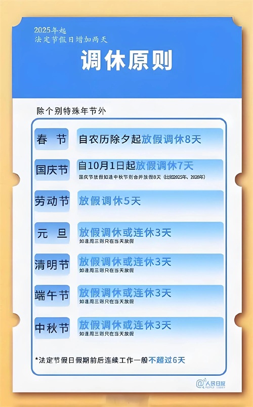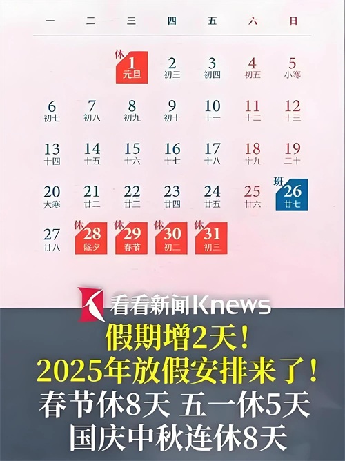 大年三十成为法定节假日,从2025年开始全民法定节假日增加2天