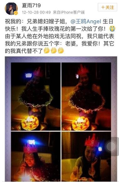 随后,更有网友扒出演员“夏雨719”2012年10月28日的一条微博,此博主称呼王鸥为“嫂子”,疑证实王鸥曾有婚史。2012年10月28日,在王鸥生日当天,“夏雨719”通过微博为王鸥送祝福,并喊王鸥嫂子,“祝我的:兄弟媳妇嫂子姐,@王鸥Angel生日快乐!我人生手捧玫瑰花的第一次给了你!由于某人他在外地拍戏无法同祝,我只能代表我的兄弟跟你说五个字:老婆,我爱你!其它的我真代替不了。”