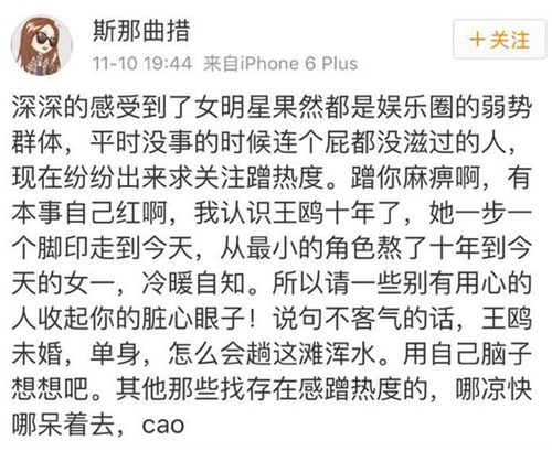 11月10日晚,王鸥闺蜜斯那曲措通过微博发声,怒斥“大嫂”徐冬冬蹭热度,她写道:“深深的感受到了女明星果然都是娱乐圈的弱势群体,平时没事的时候连个屁都没滋过的人,现在纷纷出来求关注蹭热度。蹭你麻痹啊,有本事自己红啊,我认识王鸥十年了,她一步一个脚印走到今天,从最小的角色熬了十年到今天的女一,冷暖自知。所以请一些别有用心的人收起你的脏心眼子!说句不客气的话,王鸥未婚,单身,怎么会趟这滩浑水。用自己脑子想想吧。其他那些找存在感蹭热度的,哪凉快哪呆着去,cao。”