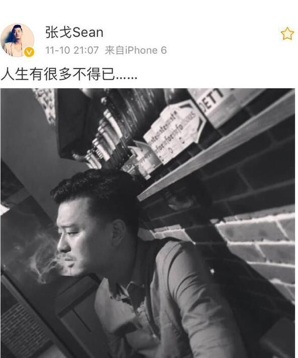 11月10日晚,张戈微博晒出一张照片,发文感慨:“人生有很多不得已……”短短一句话似包含很多无奈。照片中,张戈侧着脸吐烟圈,神情有些哀伤。