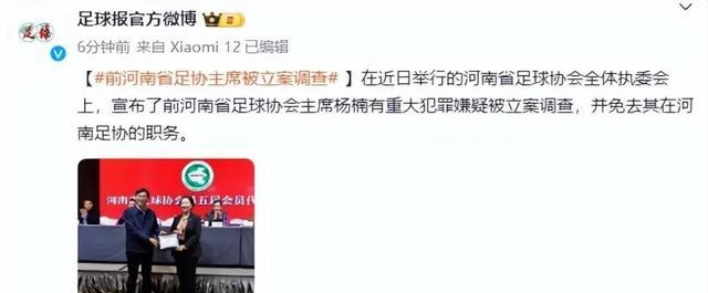11月6日,河南省足球协会全体执委会在近日举行,宣布了前河南省足球协会主席杨楠有重大犯罪嫌疑被立案调查,并免去其在河南足协的职务。这一消息引起了广泛的关注和讨论。