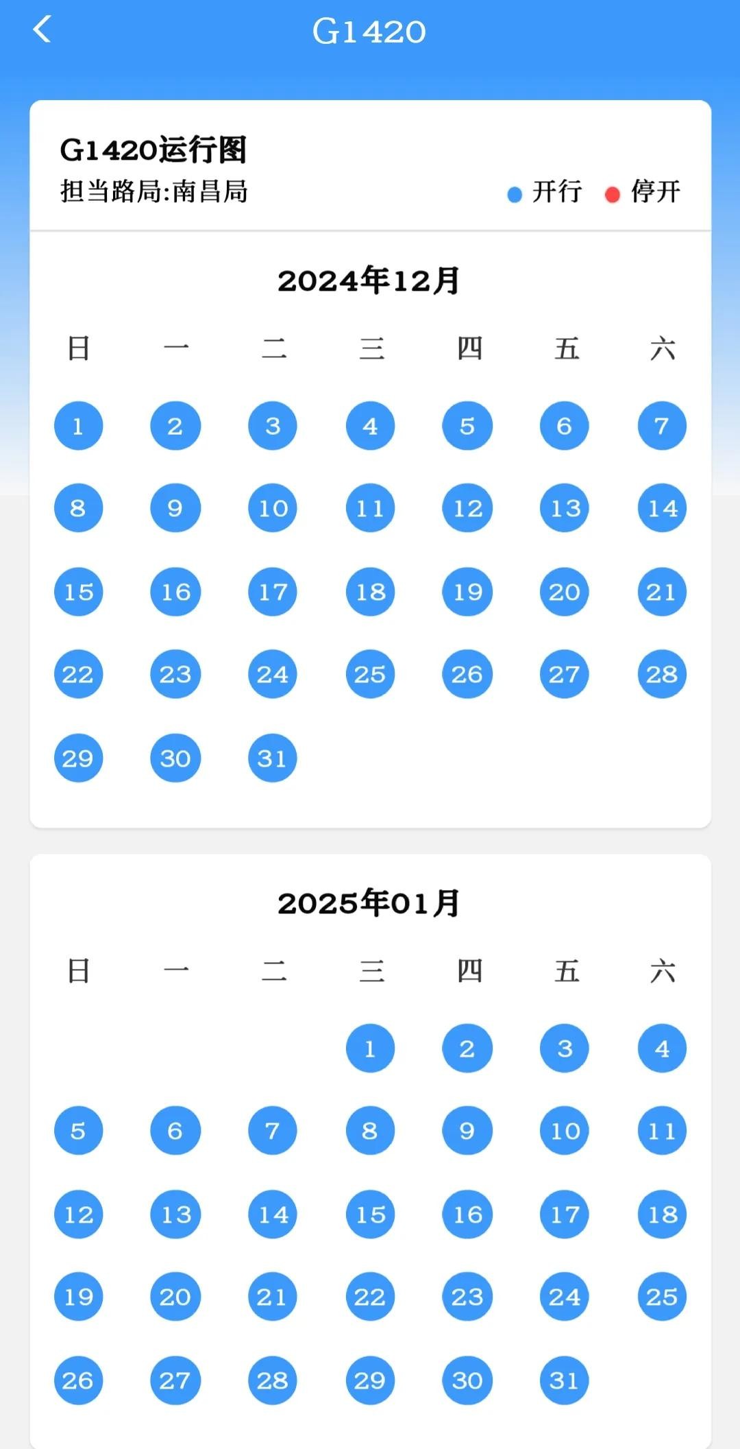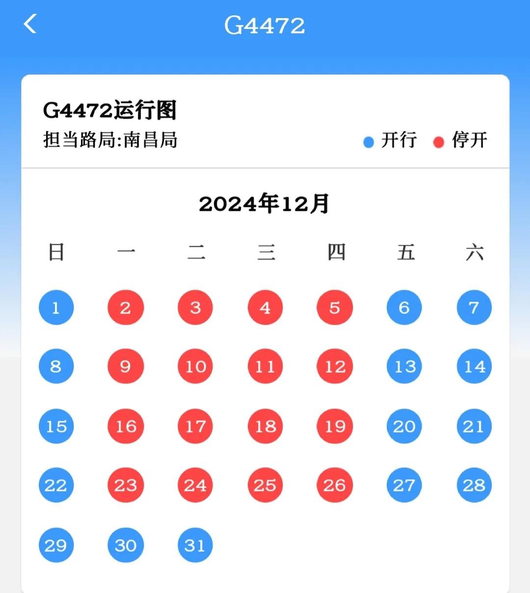 2024年12月6-8、13-15、20-22、27-31日增开南昌东-南京南G4472次,南京南-南昌东G4471次,这对车次属于周末线,因为只在每周五周六周日开行。