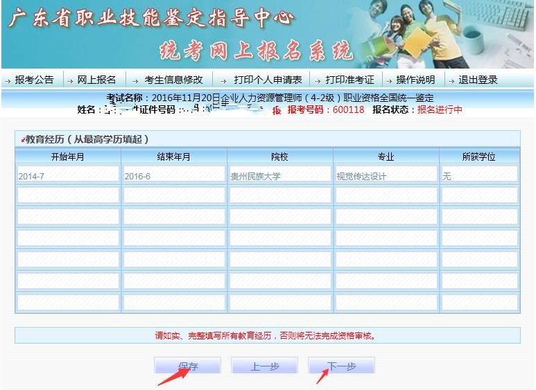 7、 填写个人教育信息(填写→保存→下一步)