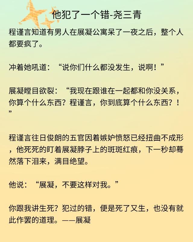《他犯了一个错》讲述的是展凝和程谨言的爱情故事,也是一篇重生文。