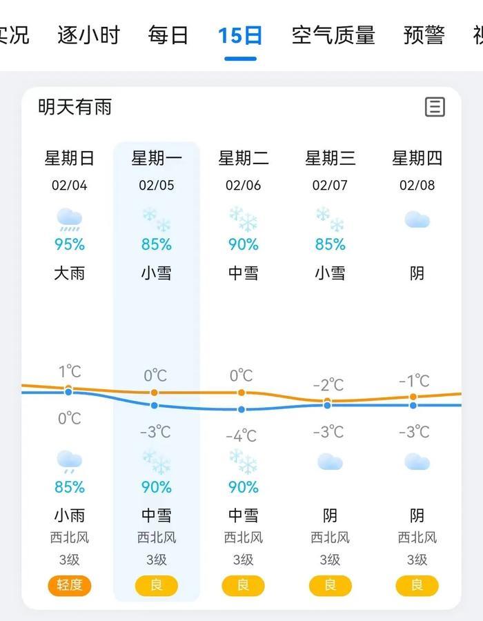 记者1月29日早间查询天气预报发现,2月5日~7日有小到中雪,气温低至-4℃。