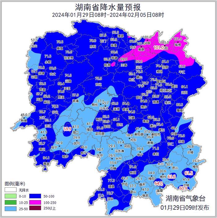 气象专家表示,未来一周湖南天气呈现三个特点:一是冻雨明显,持续时间长。2月2日至4日湘北有持续性冻雨,电线覆冰厚度5毫米至10毫米,高海拔地区局地可达20毫米左右;二是雨雪相态复杂。1月29日至2月1日以降雨为主,2月2日至4日湘北将出现冻雨、雨夹雪、纯雪;三是累计雨量大。1月29日至2月4日全省累计降水量普遍为30毫米至60毫米,岳阳、益阳北部等地70毫米至100毫米,较常年同期偏多3倍至5倍。