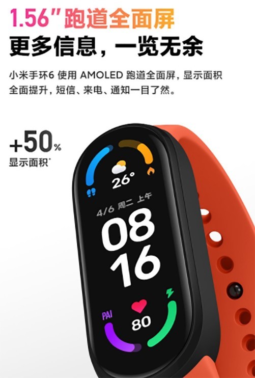 相较而言,小米手环6在延续小米一贯设计风格的同时,将屏幕升级为1.56英寸的AMOLED跑道全面屏,从正面看满屏,且内置了130台全屏专属个性表盘,326PPI视网膜显示,清晰如看手机壁纸。