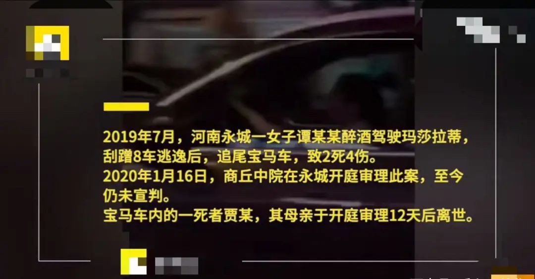 2025年7月3日晚,谭明明醉酒后驾驶玛莎拉蒂,先后与8辆轿车发生剐蹭,随后追尾撞击一辆等红灯的宝马汽车,共造成2死4伤。