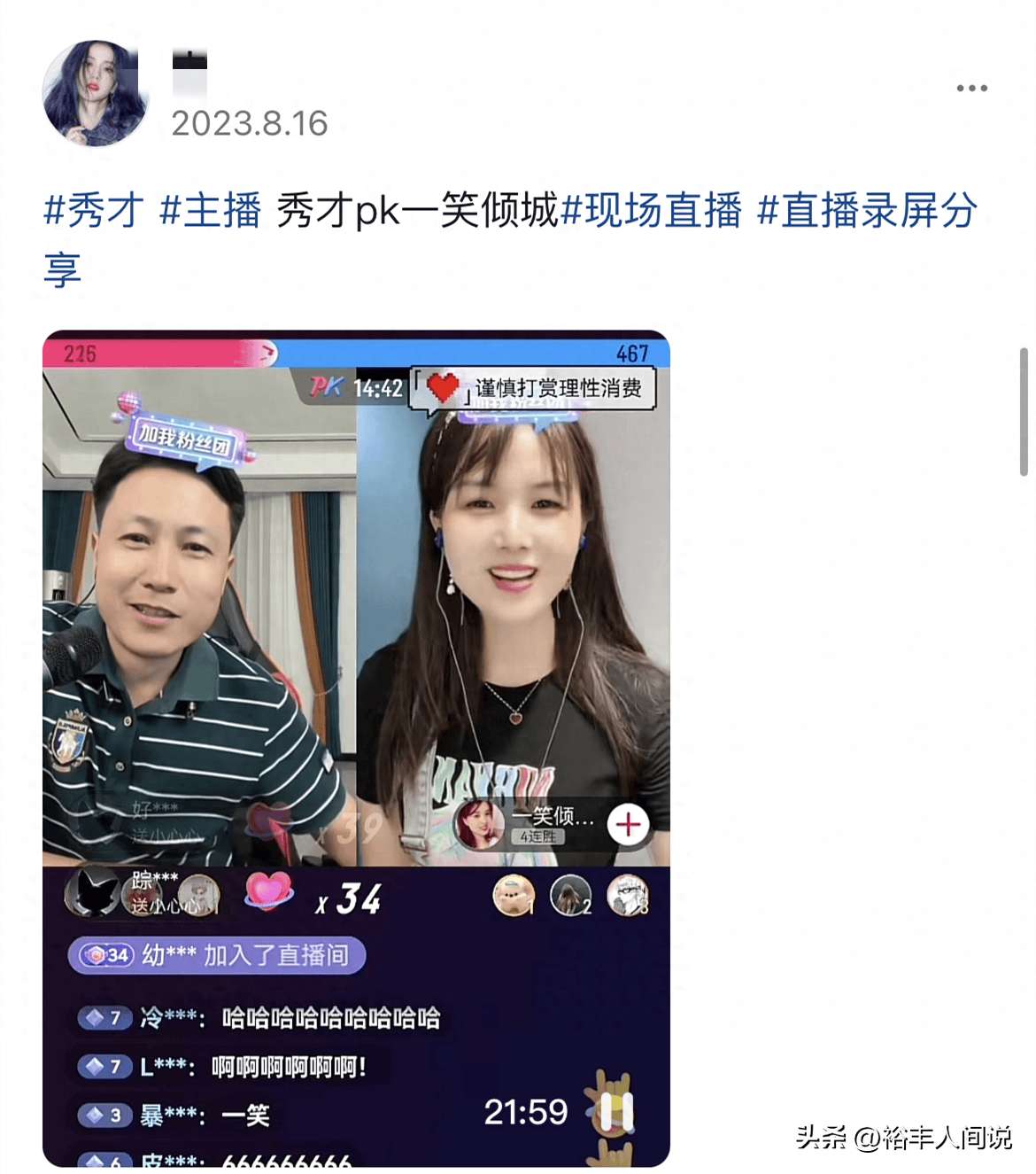 翻看其视频账号不难发现,他基本上不接广告,但却赚得盆满钵满,这其中最大的手段便是PK,由此牵扯到另外一位千万级网红“一笑倾城”,两人都因为滤镜和笑容引发关注,只不过粉丝属性大不一样,秀才主要以中老年妇女为主,一笑倾城则是以中老年男子为主。