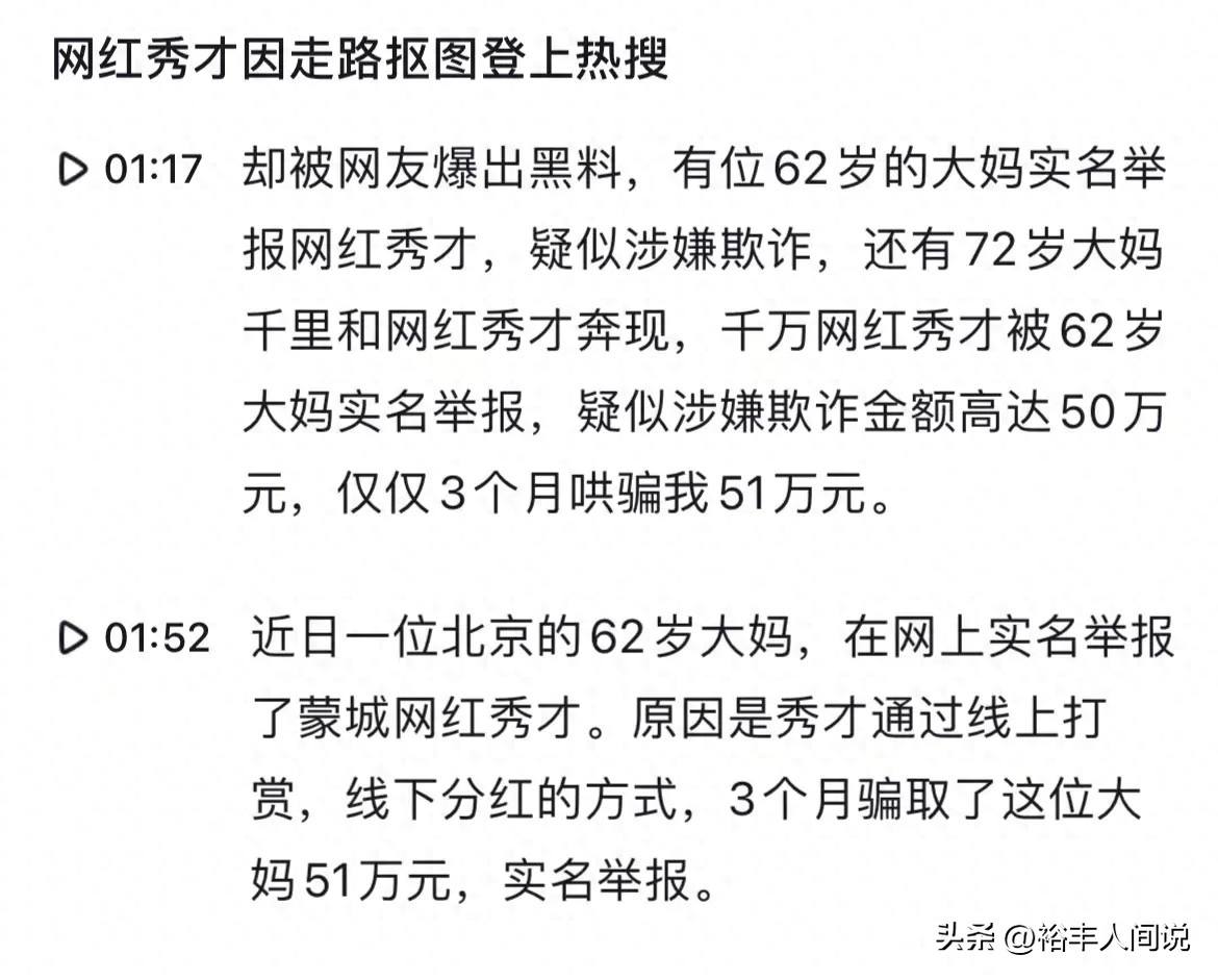 知情人士透露,秀才之所以被封禁和中老年妇女的举报有关系。一位来自北京的62岁大妈,在网上实名举报秀才,声称其利用线上打赏,线下分红的方式,三个月骗取51万元。
