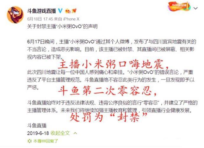 在地震发生后,她并没有对此感到伤心和难过,反而开始口嗨地震事件。她在微博上发表的两段话,让人看着气愤不已,而小米粥的这样行为很快也被网友发现并传播开来。最终,小米粥和另外一位主播仓鼠王直接上了新闻头条,被无数网友批评指责。而斗鱼平台也很快做出行动,对小米粥进行了封禁处理。
