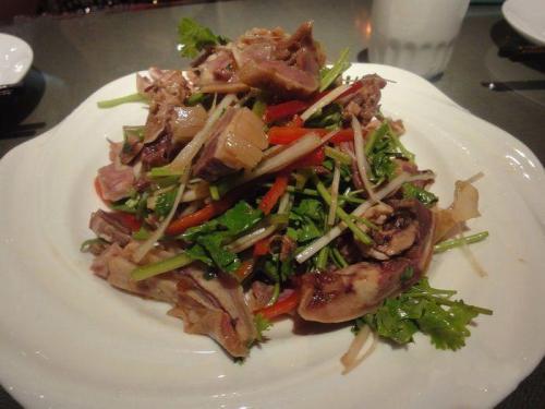 羊肉同上面一样煮熟切片,适量葱段泡入盐水约10分钟捞出。放入盆中加味精,辣椒油,醋,香油拌匀即可。