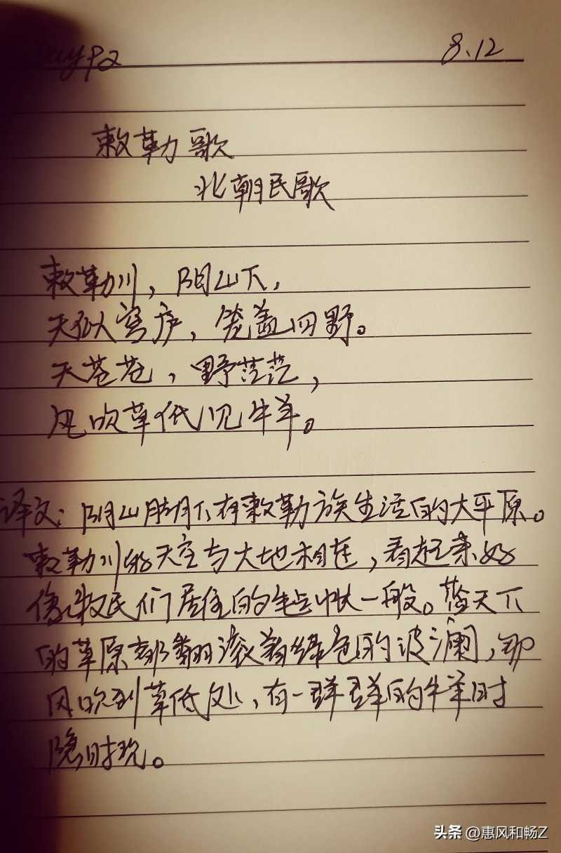 今天是我抄书打卡的第九十二天,抄写的内容是北朝民歌《敕勒歌》,在这个闷热的天气里,或许辽阔的草原上是纳凉的好去处,就让我们的心随《敕勒歌》一起飞到草原上驰骋去吧。