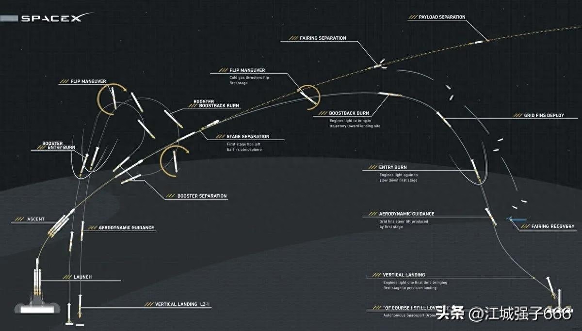 “重型猎鹰”火箭发射—入轨—回收 过程