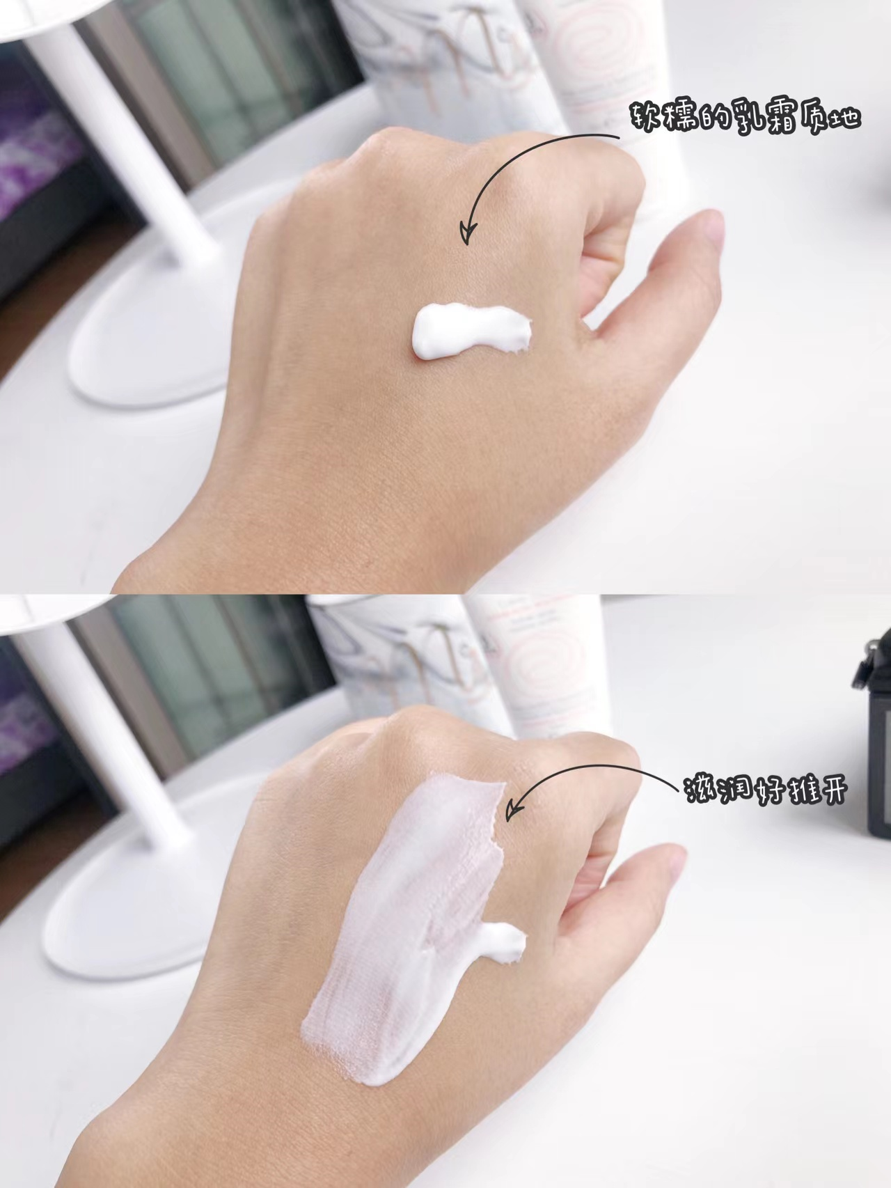软糯的乳霜质地,很好推开。涂在脸上比较滋润但是不会黏腻厚重,早上涂完,一整天下来脸上也是嫩嫩的,对敏感肌很友好。