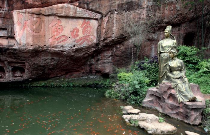 /四川省眉山市青神县中岩风景区的唤鱼池,池畔苏轼与王弗的塑像。