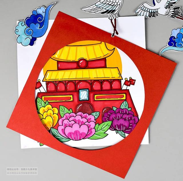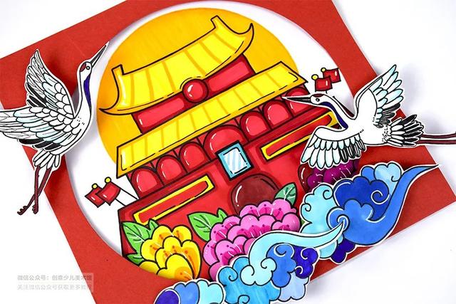2、运用鲜艳的色彩简单概括出天安门的造型和色彩之美,同时添加牡丹、祥云、仙鹤等吉祥元素,天安门儿童画手抄报,烘托出国庆节的欢乐喜庆的氛围门简。