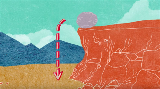 这个公式表示任何物体之间都会互相吸引,也就是说,如果你有两个物体–随便两个东西–都会互相吸引。我们想想看,假设你在悬崖边向下扔一块石头,会出现什么情况?