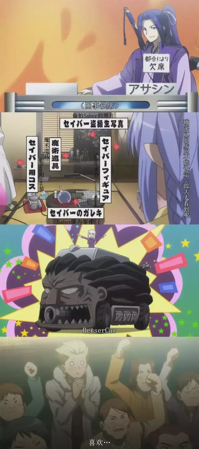 除了幸运E的梗以外,经常被调侃的Fate梗还有小次郎的存在感,Saber控C妈的满屋手办,BerserCar,呆毛王的黑化开关,英雄王金皮卡的末路等等