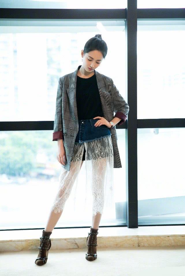 我们来看一下陈钰琪的其他穿搭,看看有什么样的视觉效果。她扎着一个丸子头,显得青春靓丽。穿着一件黑色T恤,搭配灰色西装,简约而不失优雅大方。这一件西装采用了格纹的元素,打破了纯色的单调。下半身穿着一条白色的蕾丝裙,透视的设计,若隐若现地露出了白皙的双腿,又细又直的腿型,让人大开眼界。