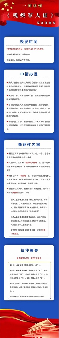 另外,2020年8月1日起至今,《残疾军人证》《伤残人民警察证》《伤残预备役人员民兵民工证》《因公伤残人员证》等证件换发工作持续进行中,本次换证采取以旧证换新证的方式进行,换证期间新旧证件均有效。
