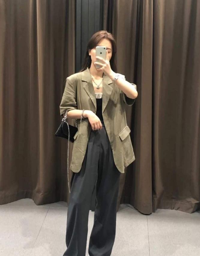 棉麻材质的西装版型真的超级好,有点小垫肩,所以完全可以撑起来帅气女孩的气场。针对南方的天气不冷不热的天气来说,着实很好。内搭一件黑色小背心,颜色跟灰色裤子也是比较相配的,穿起来的质感很不错。