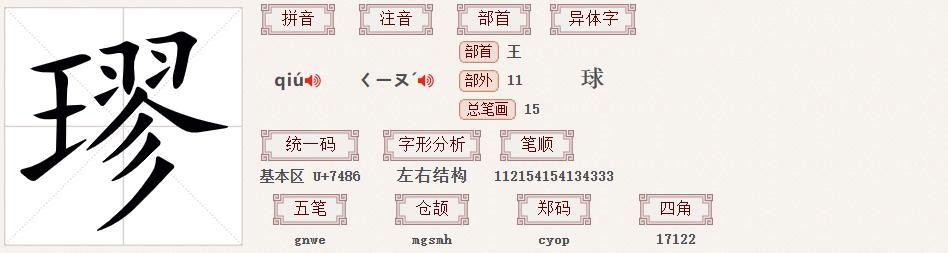 璆的同音字:qiú 球 遒 求 囚