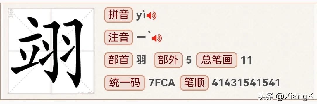 读音为“yì”,同音字“议”,部首为“羽”,总笔画11,左右结构。