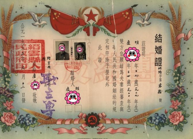 从1950年《婚姻法》实施至1986年《婚姻登记办法》颁布前,结婚证多为“奖状式”,全国没有统一样式。结婚证上多印有和平鸽、稻穗、棉花、并蒂莲等充满浓郁的民族风格的图案,反映出当时农业在国民经济中的主体地位。结婚证上新郎新娘的名字开始并列在一起,体现了男女平等、婚姻自主的婚姻关系。