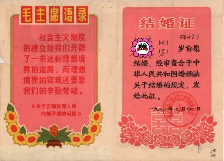到了“文革”期间,一切东西都被披上了政治色彩,结婚证当然也不例外。那时每张结婚证上都必有一段毛主席语录:“全心全意为人民服务”“千万不要忘记阶级斗争”“我们都是来自五湖四海,为了一个共同的革命目标,走到一起来了……”