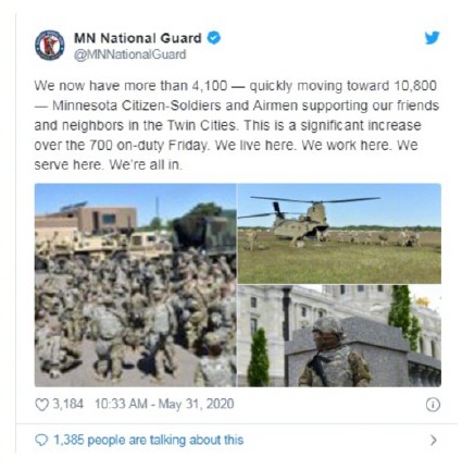明尼苏达州国民警卫队官方推特表示,这是自该州国民警卫队自第二次世界大战以来的首次全面动员。