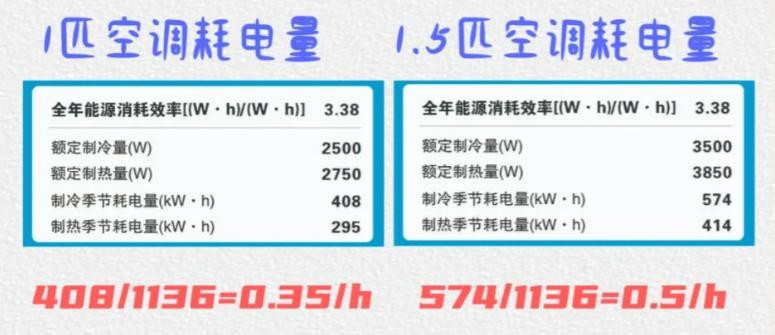 如果单纯的按照空调的耗电量对比来看,1匹的空调耗电确实会比1.5匹的空调更低。所以很多人觉得 1.5 匹肯定比1 匹费电,但其实不一定。