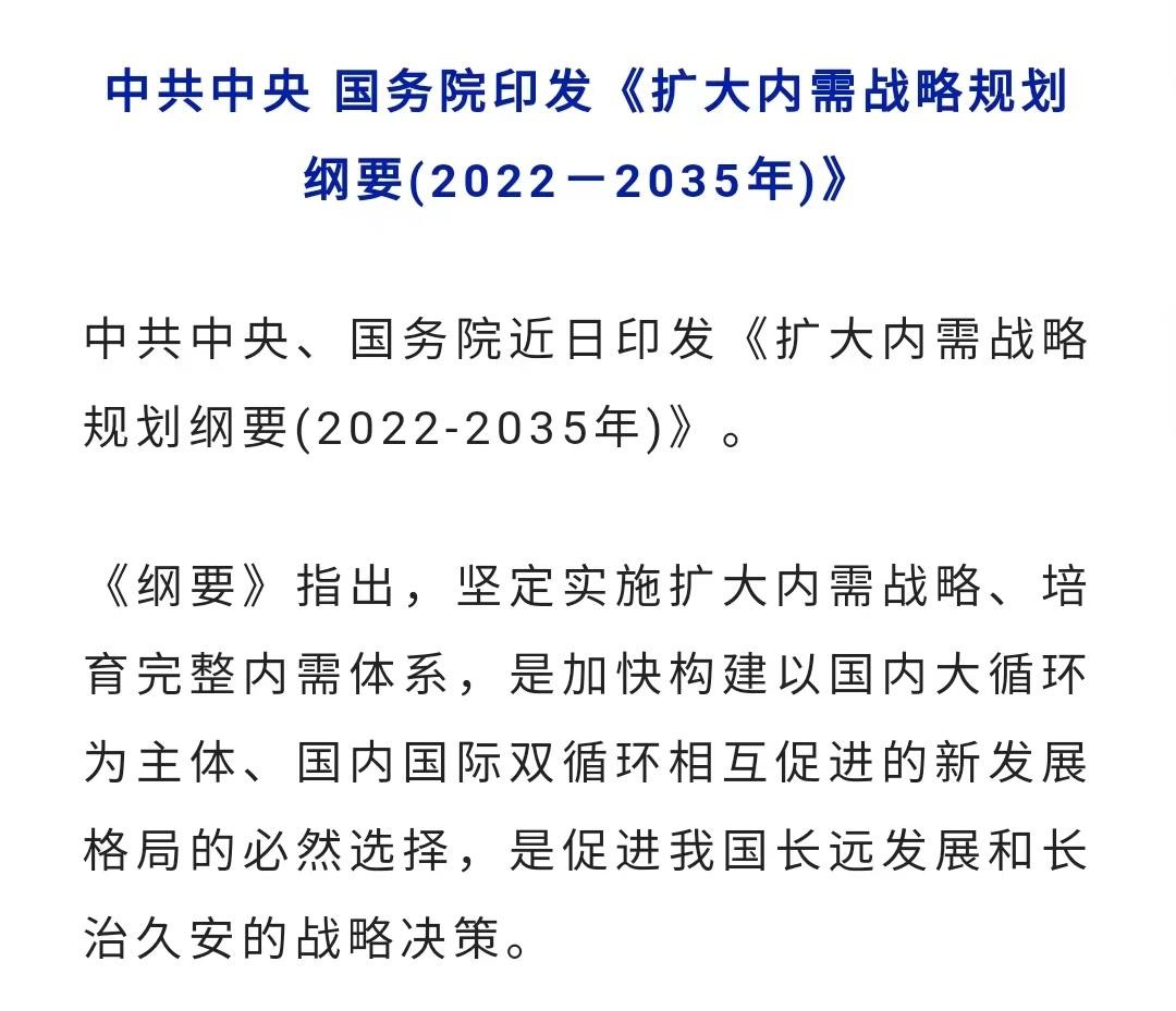 中共中央、国务院印发了《扩大内需战略规划纲要(2022——2035年)》,并发出通知,要求各地区各部门结合实际认真贯彻落实: