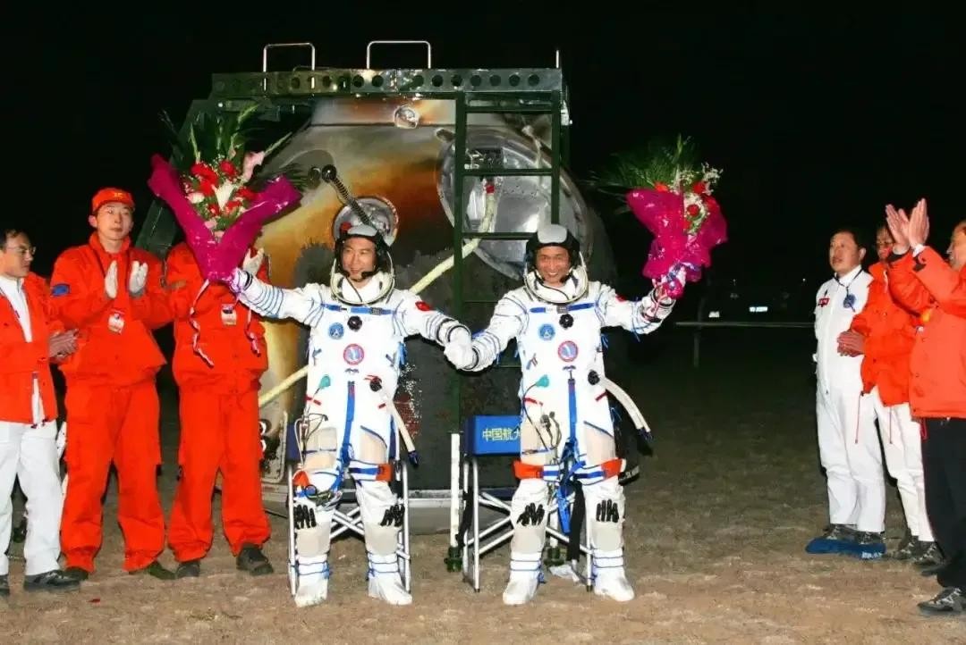 神舟六号返回舱成功着陆,航天员费俊龙、聂海胜顺利出仓。