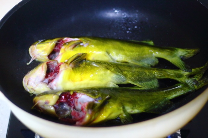3、等待油烧热之后放入嘎鱼,小火慢慢煎。嘎鱼下锅前建议沥干水分;