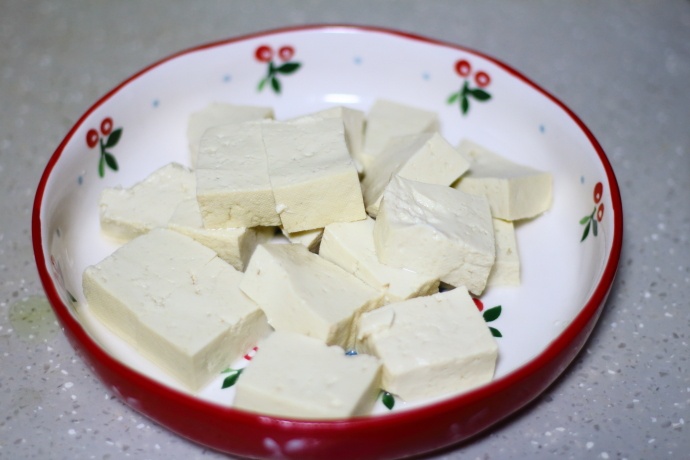 7、趁炖鱼的空闲时间将豆腐切成1cm左右厚的小块;