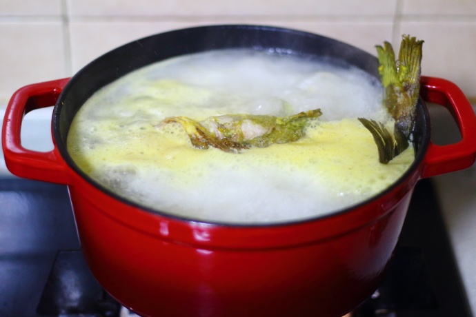 9、炖至汤慢慢变奶白色时加入少许盐,继续炖3分钟左右后关火;