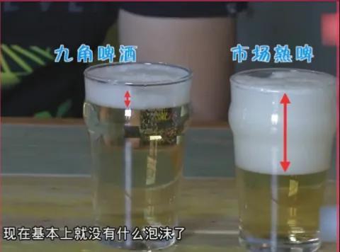 接着我们找到了从事自酿啤酒有六年的专业人员来鉴定一下这类廉价啤酒。可以看见将正常的啤酒和廉价啤酒放在一起对比就发现了两者的不同。廉价啤酒的气泡和正常的比起来相差许多,味道也没有什么酒的味道,就像是带有一点酒味的苏打水一般。这样的话就可以解释的通了,九毛的啤酒就不是啥正经啤酒,其就是带有酒味的碳酸水罢了。