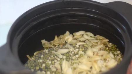 2.把绿豆、薏米、百合和水放进煮锅里,大火烧开后,转小火煲1个小时;